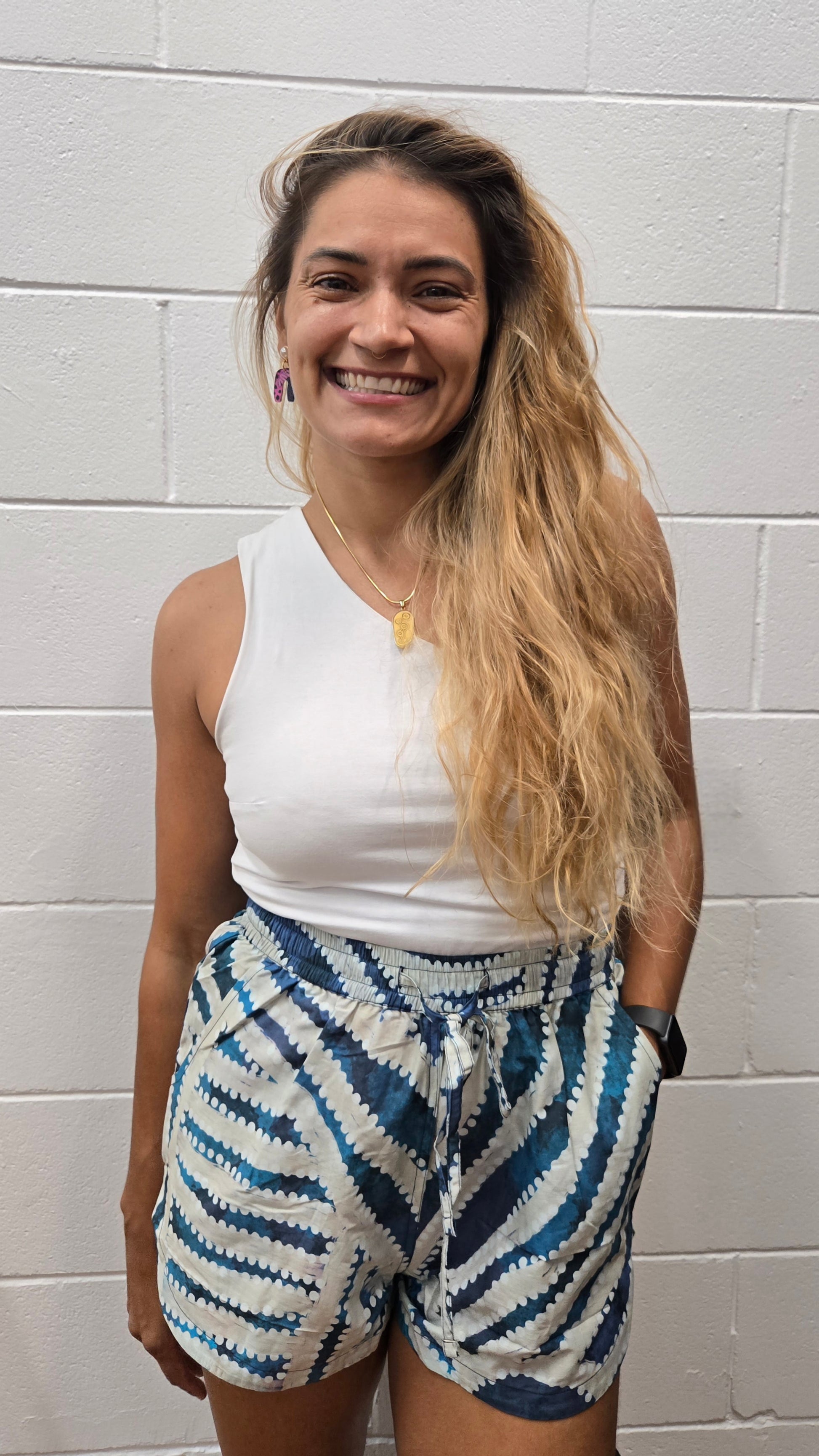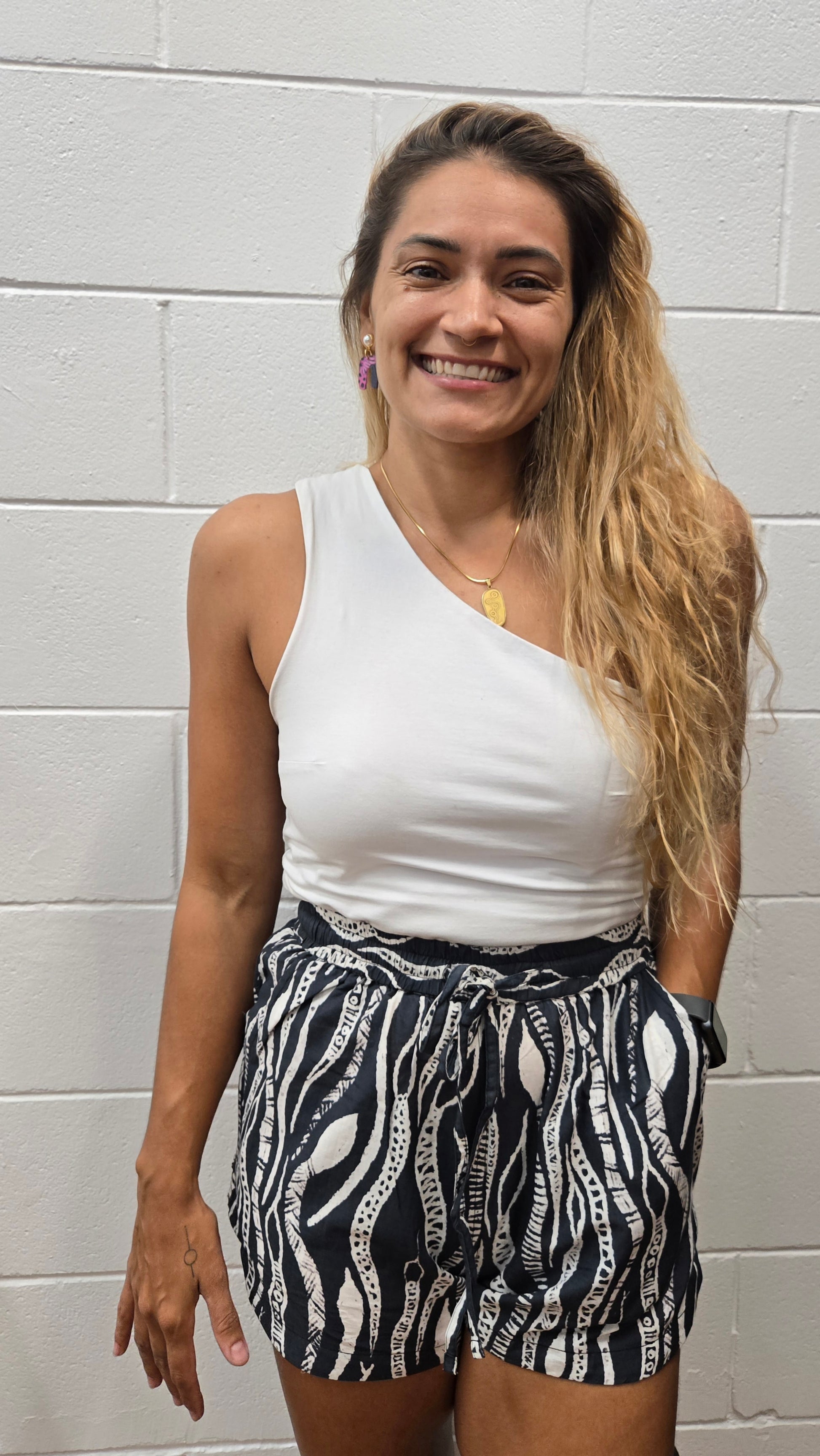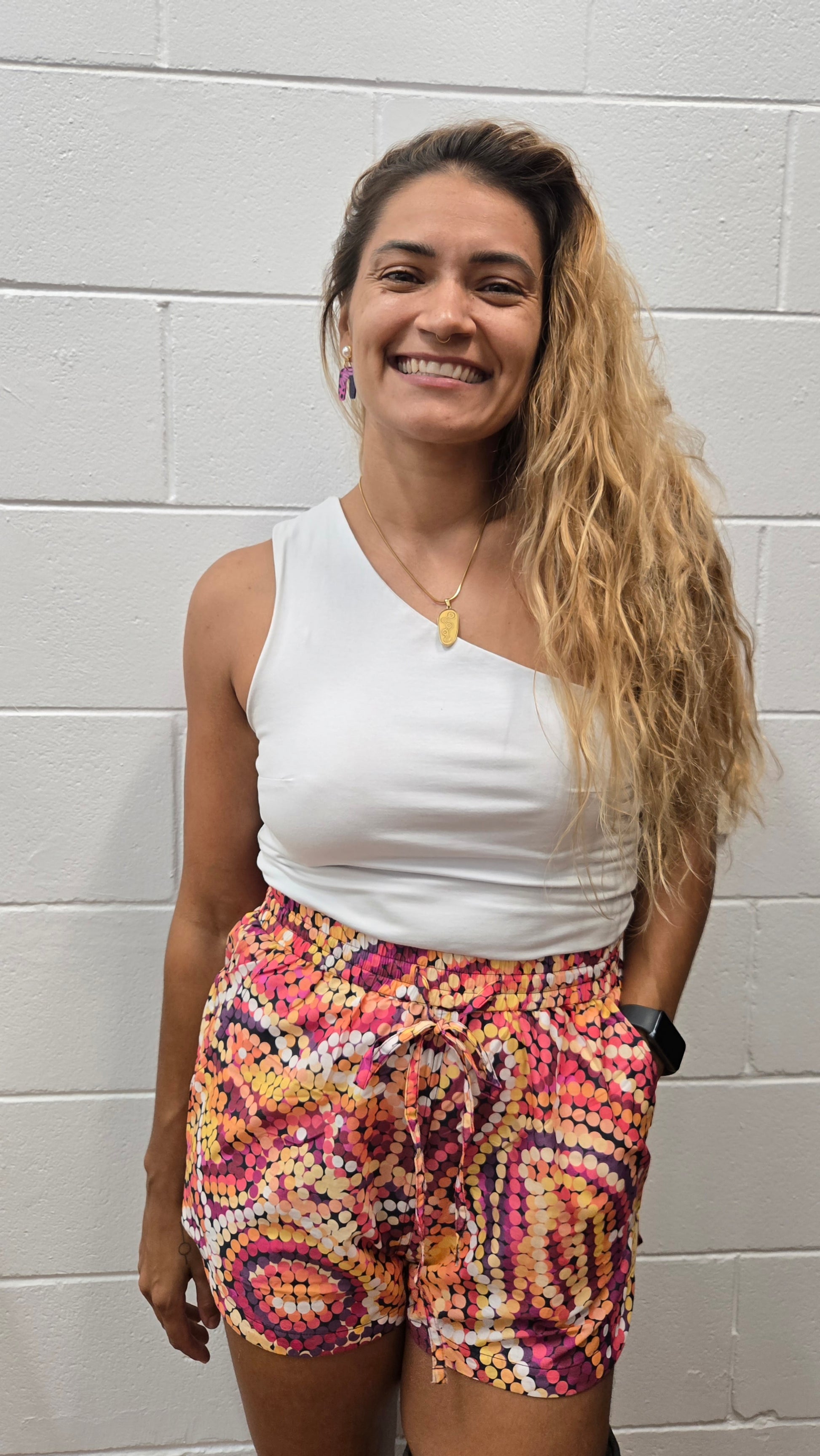 These 100% cotton shorts are a stylish and comfortable addition to any wardrobe, featuring a unique scalloped leg design and practical pockets. They can be worn on the hips or styled high-waisted, making them versatile for various looks. Adorned with contemporary Aboriginal art by Tarisse and Sarrita King, these shorts not only celebrate cultural expression but also support Indigenous artists. Perfect for warm weather, they can be easily dressed up or down, making them a year-round staple.