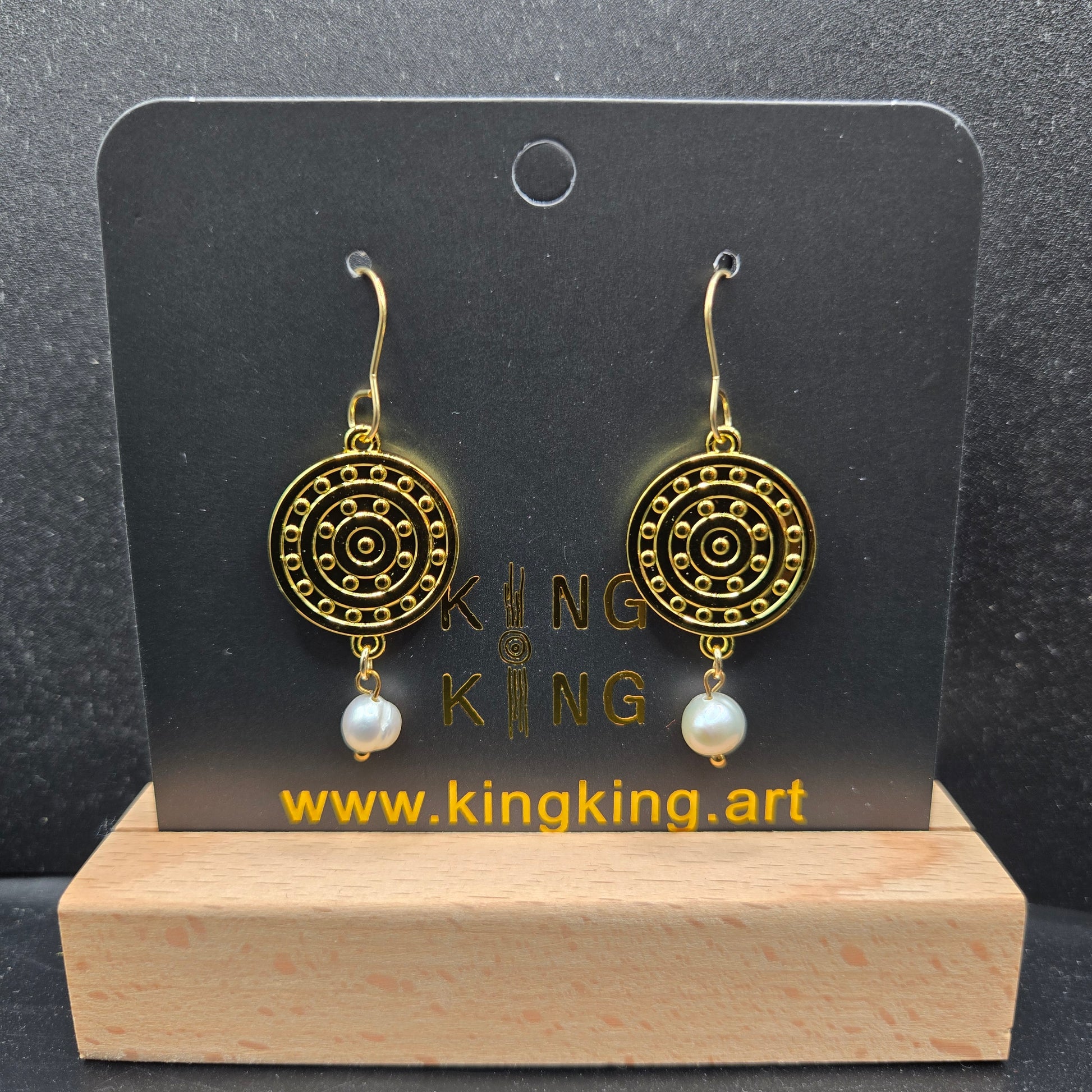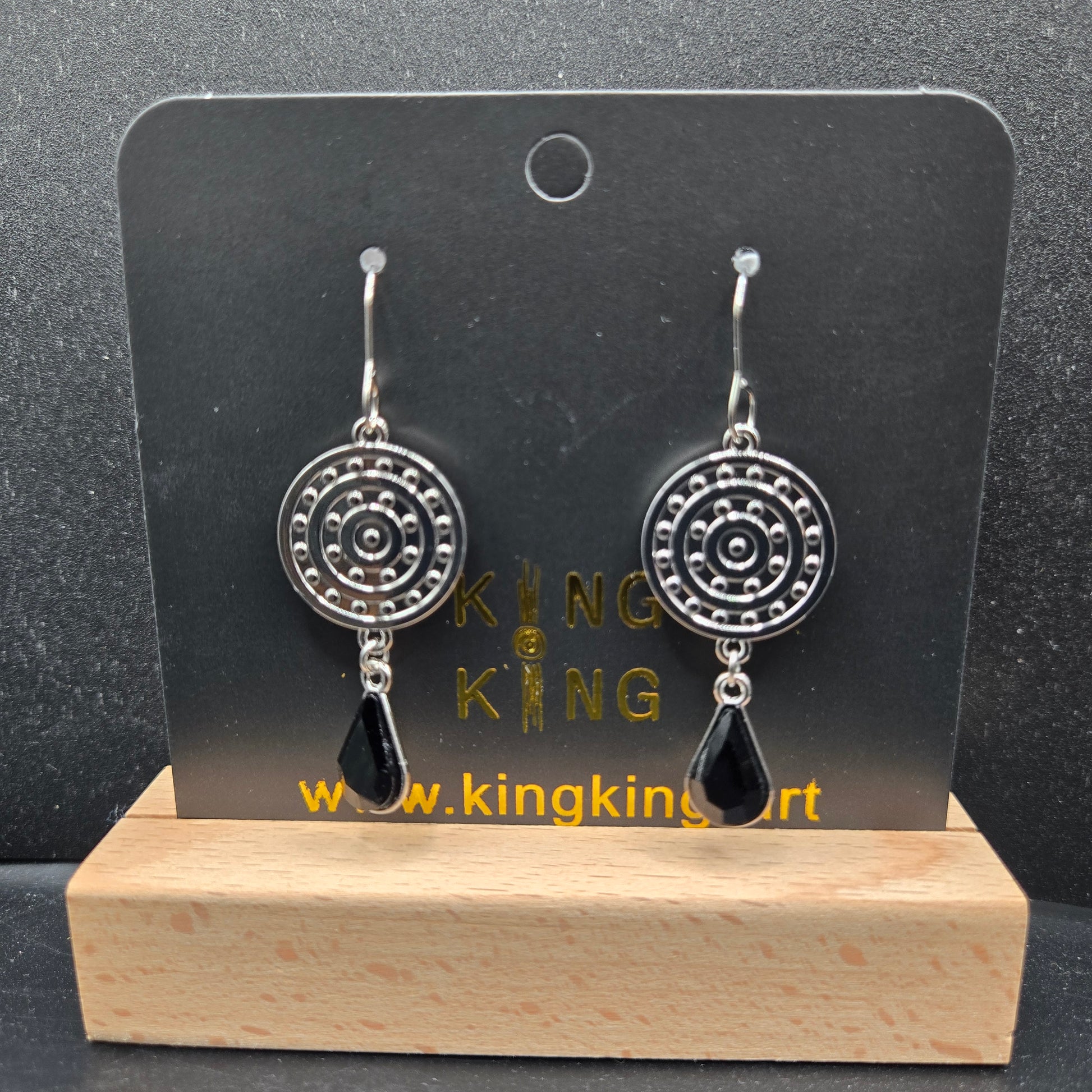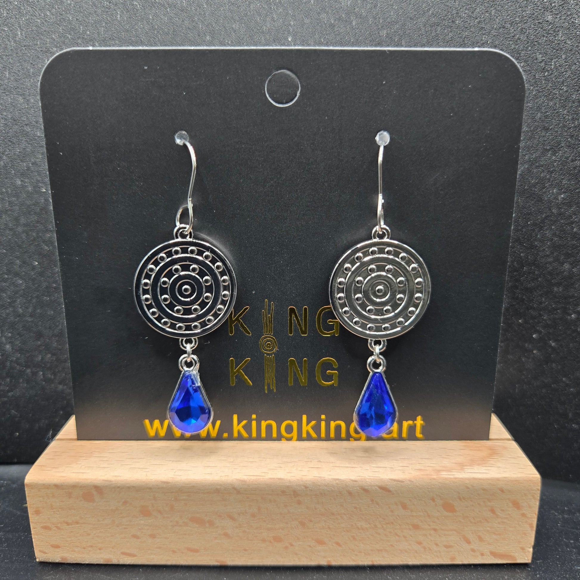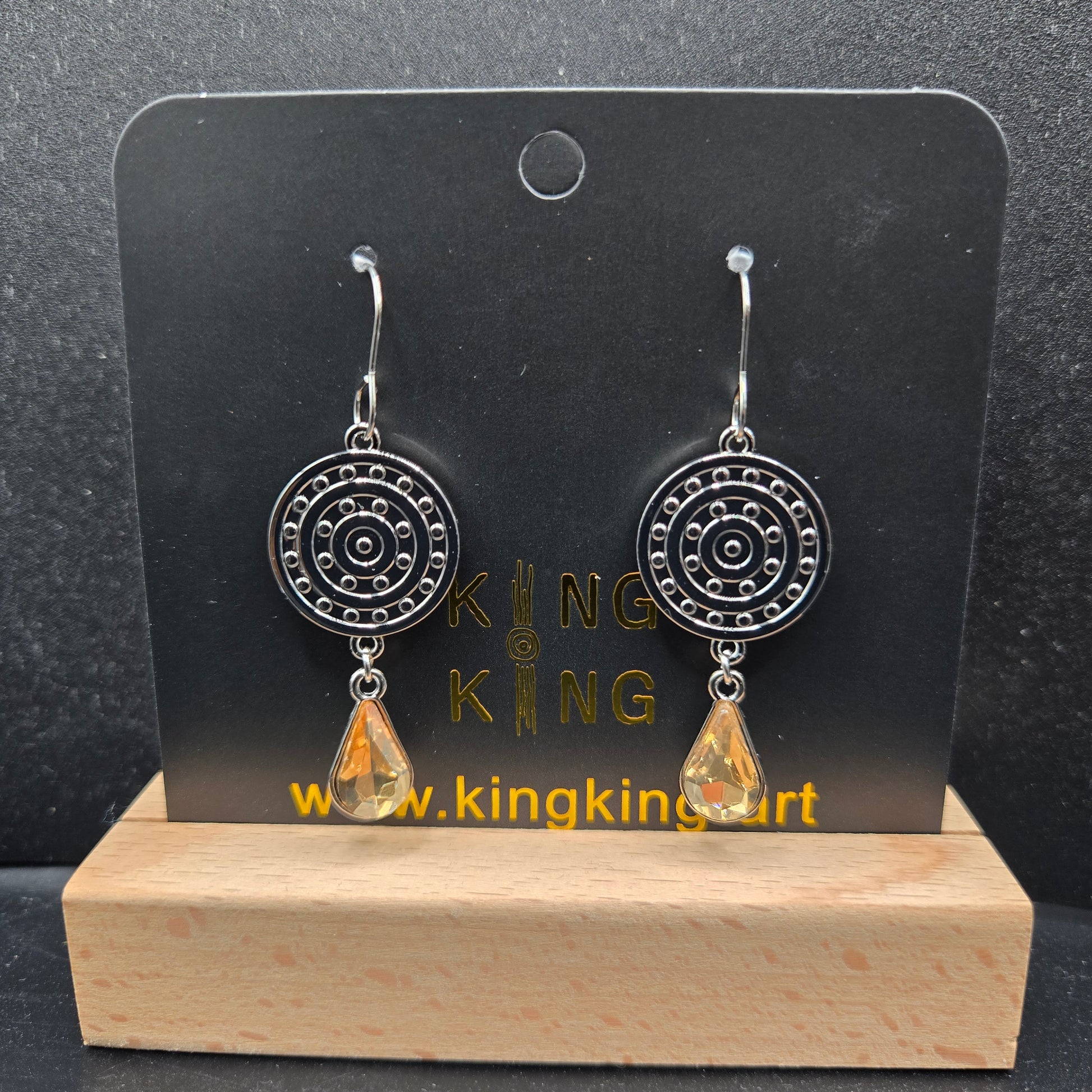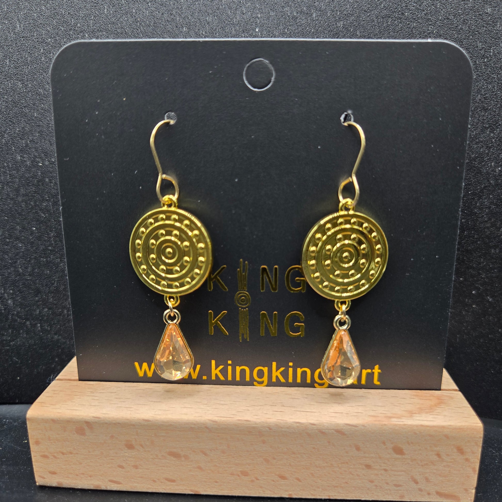 Artwork is a campsite on both sides. Stainless steel earring hook. Zinc alloy metal body. The crystal is glass. The gold finish will rub off over time. Please be careful when taking on and off making sure loop is closed between campsite and gem.